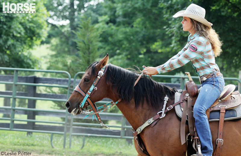 Taylor advises against too much stopping and backing up. “One common rider mistake I see is not enough forward motion,” she says. “I also see not enough hind-end engagement, meaning the horse doesn’t know how to use his motor on the back side; he doesn’t know how to get his legs underneath him. My suggestion for that is rollbacks in the arena.”
