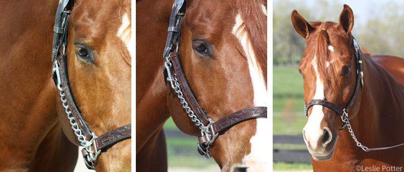 If you use a chain, run it under the horse’s jaw and up the cheekpiece, clipping it to the top ring with the snap facing out (left photo). If your chain is too long, a quick solution is to double the clip back on the chain (center). Photos: Leslie Potter