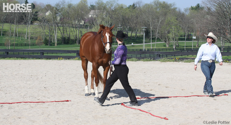“One exercise I like to use involves laying brightly colored lead ropes on the ground,” says Bartley-Lehman. “I position the lead ropes in a straight line forward in front of the horse’s nose, backward away from the horse’s tail and outward from the horse’s left and right forelegs. Then I have someone play the judge and walk around the horse at various speeds, stopping, starting and changing directions. The exhibitor should practice moving around the horse as the pretend judge walks around the horse until it becomes second nature.”