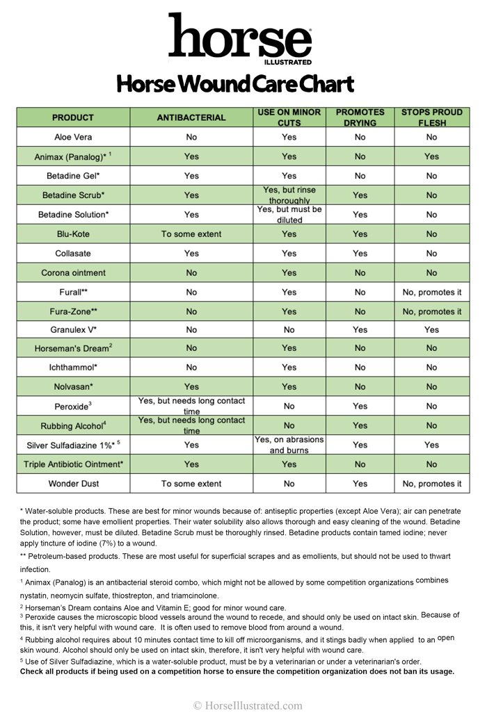 Download a free chart about wound care products for horses with possible products to use, if they are antibacterial, and if they promote drying and stop proud flesh.