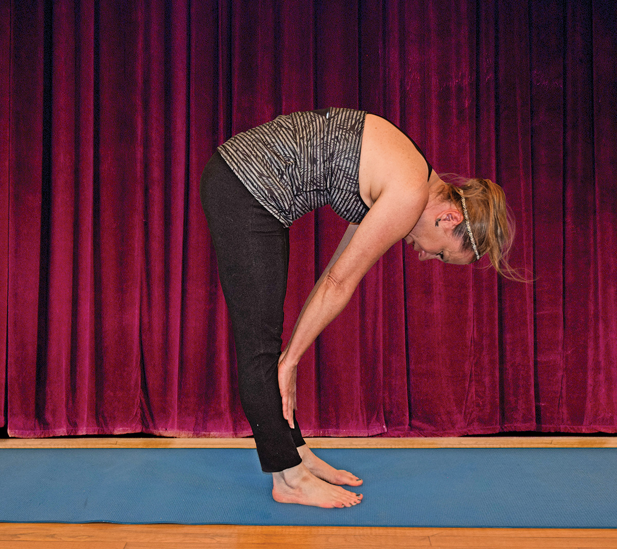 ◆ Stand with feet hip-width apart. Inhale and raise your arms overhead; with a flat back, exhale and swan dive forward, placing your hands on your shins, feet, or the floor, depending upon your level of flexibility.