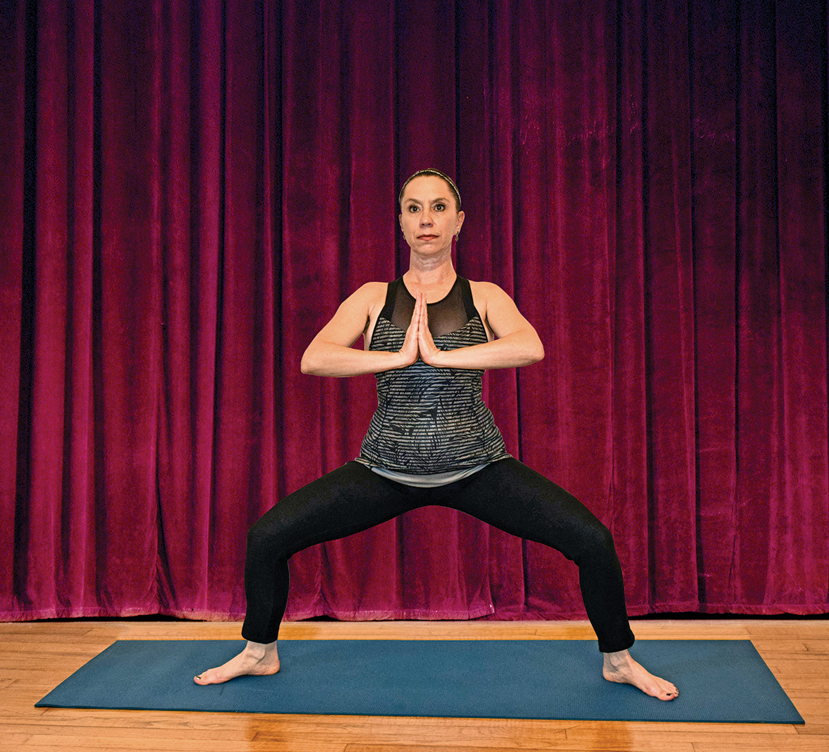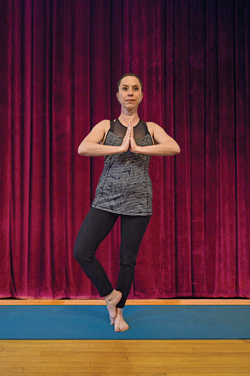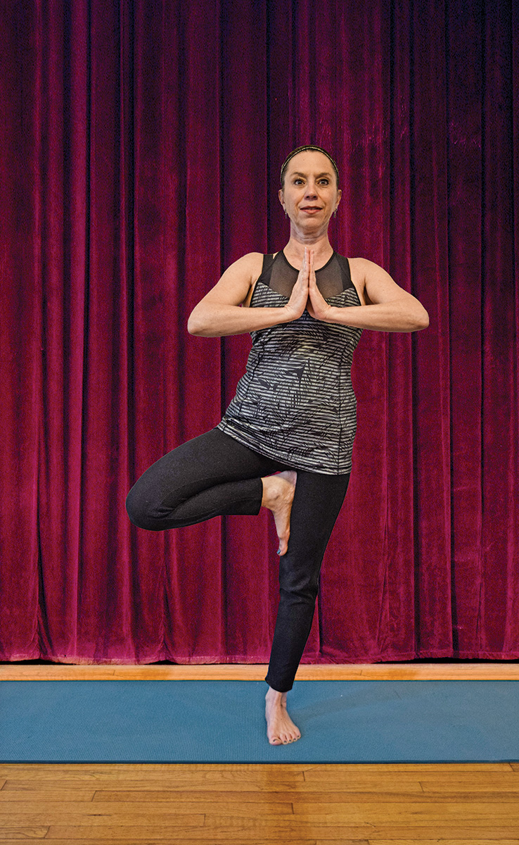 ◆ If challenged by Tree Pose, there’s no harm in using a wall, chair back, or windowsill to lightly place a hand if you feel wobbly.