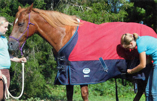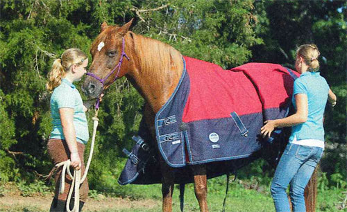 If your horse has never worn a blanket before, let her smell it and rub it gently on her back and shoulders. Some horses think brand-new blankets can be scary!