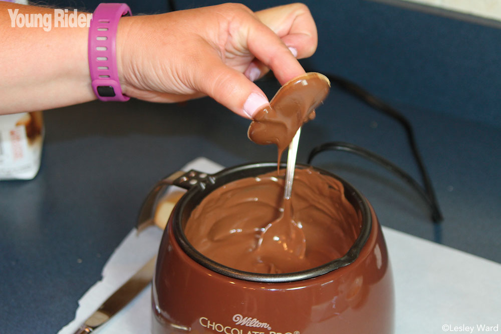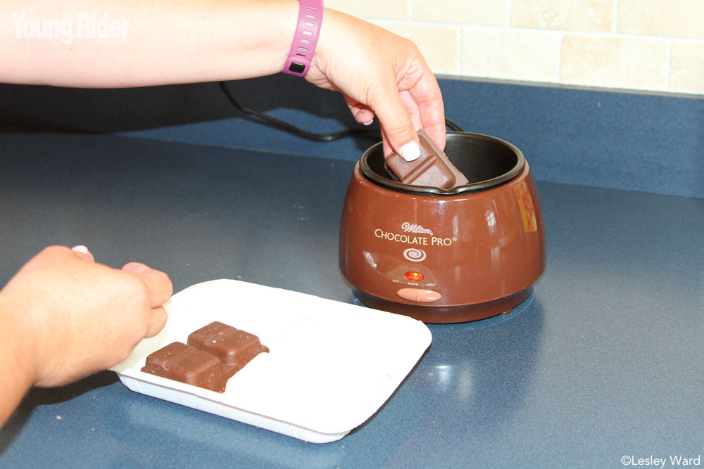 If someone likes to cook in your house, there just might be an electric chocolate melter hidden away in the kitchen. If so, use it to melt the baking chocolate. No melter? Bring about an inch of water to a simmer in a saucepan and then place a heatproof bowl containing the chocolate over the saucepan. Don’t let the water touch the bottom of the bowl. Be patient and stir the chocolate until it’s smooth and creamy. Yum. - Horse Dunkers