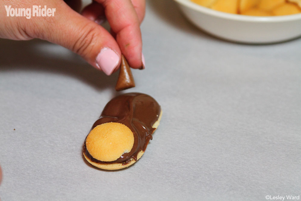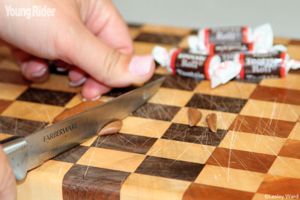Cut tiny triangles out of a Tootsie Roll or taffy to make the horse’s ears. Be super careful with the knife! - Equine Ears