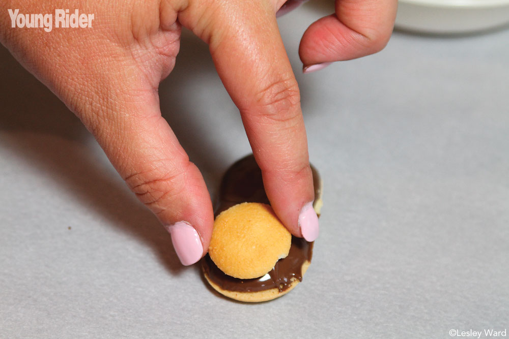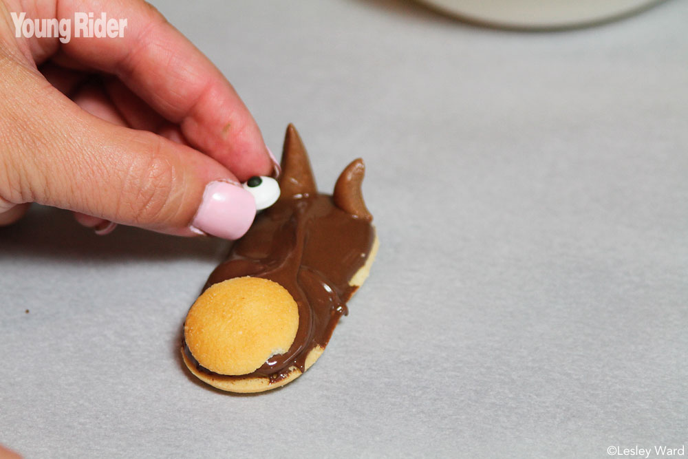 Gently press the candy eyes into place. Now the cookies are starting to look like horses! - Noseband