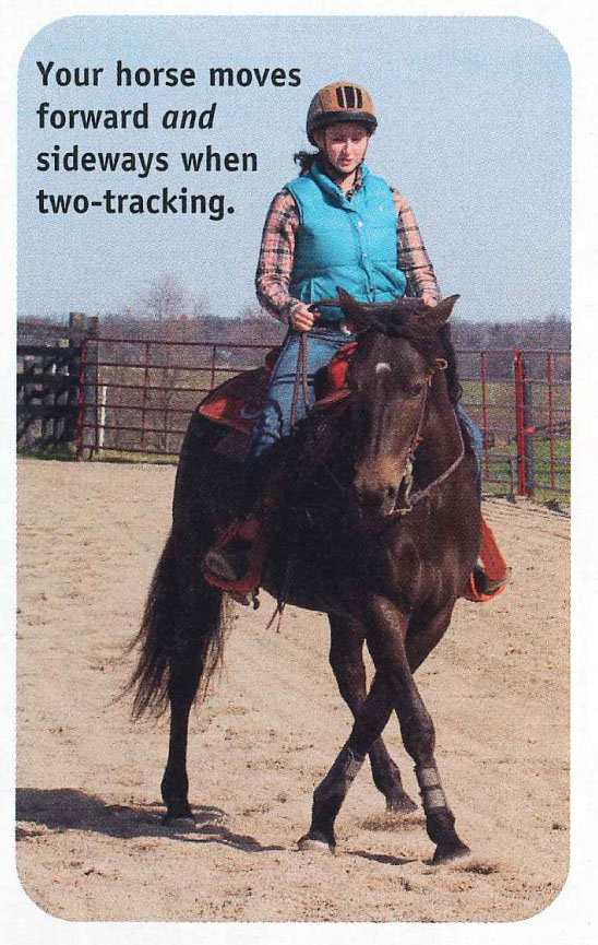 Two-tracking is a combination of going forward and side passing. Your horse’s forelegs and hind legs cross over as he goes forward. Once again, your horse has to move off your leg quickly to do this movement successfully.