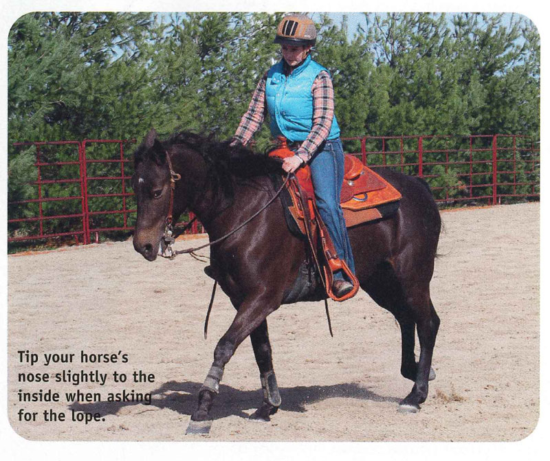 Before you teach your horse flying changes, your horse should be able to pick up the lope from the walk. Reining patterns don’t include the jog—all work is done at the lope or gallop. To ask for the lope from the walk, make sure your horse is walking in a forward, active pace. Use both hands to take up some of the slack in the reins and tip his head slightly to the inside. You should be able to see the corner of his eye. Any more and you’re bending him too much. Sit deeply in the saddle and press your outside leg to your horse’s side. Keep your inside leg at the cinch. Slide your outside leg back a few inches and apply pressure. If he doesn’t respond immediately, give him a bump with your calf. Your horse needs impulsion for a good lope departure.
