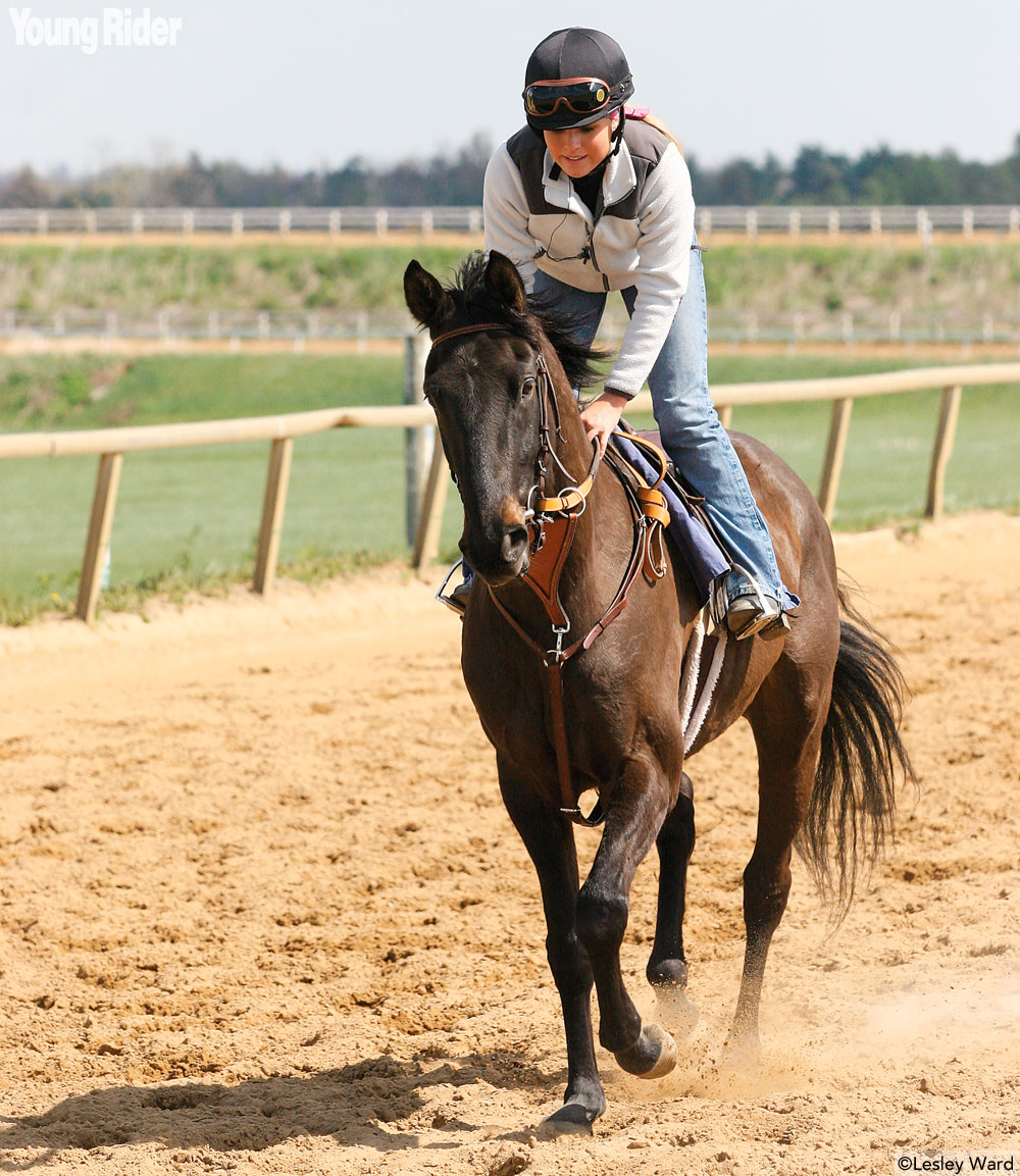 Think about how a jockey stands up in the stirrups while galloping a racehorse. His stirrups are very short and his racing saddle is small and lightweight, so it can be a big surprise to a former racehorse when his rider uses an English saddle for the first time! Suddenly the rider’s stirrups and legs wrap all the way around the horse’s barrel, and the saddle flaps reach down onto his sides—this can be a big shock to some young horses.