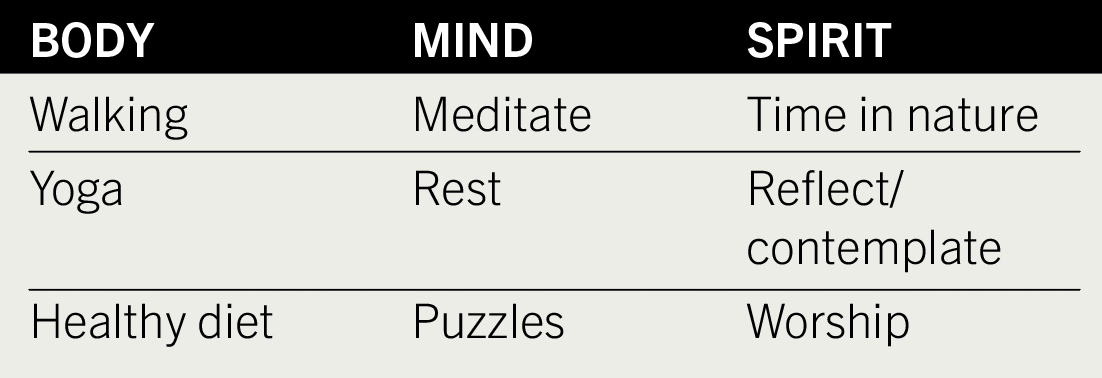 Create a three-column list: Body, Mind & Spirit. Under each column, list activities that support how to best care for each aspect of your being, and do at least one from each column every day.